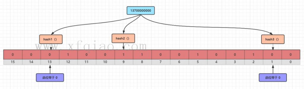 对 13700000000 分别进行 hash1()、hash2()、hash3() 运算,得到三个结果 1、9、13,然后去判断第 1、9、13 位上的值是 0 还是 1,如果不全是 1 的话,就说明 13700000000 不在这个布隆过滤器上;这就确定了“某项数据肯定不存在”。